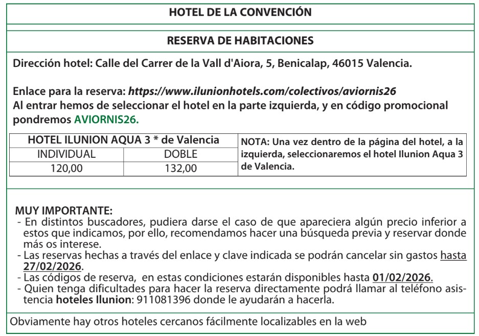 Dirección hotel: Calle del Carrer de la Vall d’Aiora, 5, Benicalap, 46015 Valencia. Enlace para la reserva: https://www.ilunionhotels.com/colectivos/aviornis26 Al entrar hemos de seleccionar el hotel en la parte izquierda (Hotel Ilunion Aqua 3), y en código promocional pondremos AVIORNIS26.